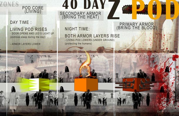 Premda se s vremena na vrijeme pojavi neki natječaj čiji je koncept i program fokusiran na zaista traumatična životna iskustva, situacije koje muškarce, žene i djecu, primoravaju na njihove primarne iskonske potrebe za preživljavanjem te kao cilj ima rješenje istih, generalno takvih natječaja na svijetu nema dovoljno. Takve su činjenice izuzetno zanimljivi inputi, pa vjerujemo kako će u budućnosti ova tematska „rupa“ internacionalnih natječaja češće biti popunjena. No jedan, krajem prošle godine završen natječaj, ipak se pozabavio apokaliptičnom tematikom, pa je pred natjecatelje postavio zadatak obrane od, vjerovali ili ne, zombija.