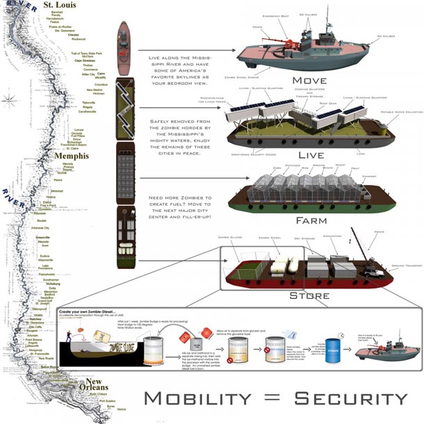 2010 Zombie Apocalypse Safe House Competition, kao što mu i samo ime govori, od sudionika je tražio prijedloge koncepata i projekata utočišta te obrane od napada horde zombija, pod pretpostavkom da se ljudskoj rasi bliži kraj. Neke od smjernica koje su participanti natječaja dobili bila su i niz pitanja koja su se odnosila na detalje, tehničke karakteristike i raznorazne uvjete preživljavanja spasonosne kuće i njezinih potencijalnih korisnika. Kao pobjednički rad izabran je projekt SS Huckelberry, a više o tom radu, ostalim natjecateljima te opširnije objašnjenje ideje i realizacije natječaja pogledajte ovdje.