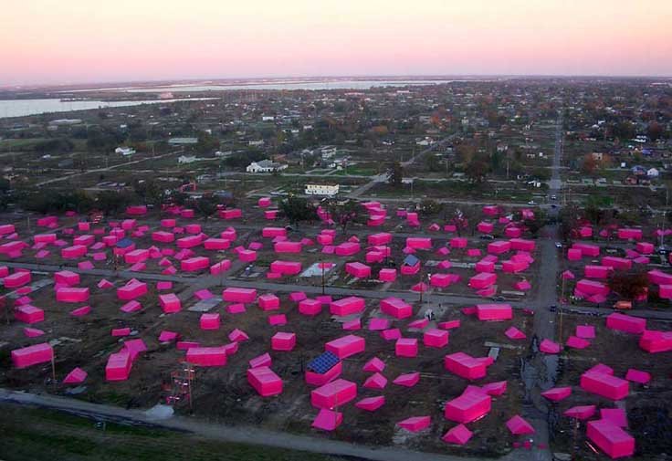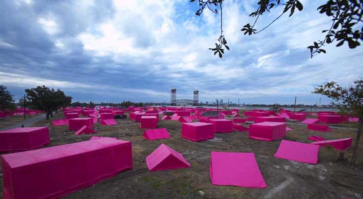 Za podizanje interesa javnosti i angažiranje donatora u projekt, prošle je godine, na lokaciji gdje je sada u procesu izgradnja ovih kuća, postavljena umjetnička instalacija 150 privremenih šatorastih struktura, koje su predstavljale budućih 150 kuća. Privremeni objekti, presvučeni tkaninom žarke ružičaste boje, funkcionirali su kao upečatljiva i dojmljiva prostorna instalacija, ističući se snažnom bojom po danu, a unutarnjim osvjetljenjem po noći, u snažnom kontrastu sa zapuštenim i uništenim okruženjem na koje su postavljeni.