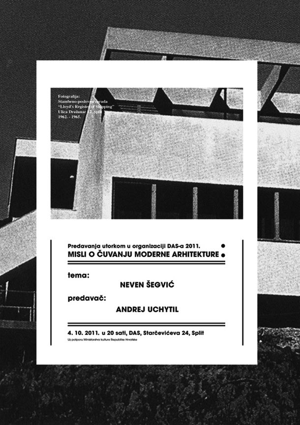 U utorak, 4. listopada u 20 sati u prostorijama Društva arhitekata Split održano je izlaganje Andreja Uchytila o liku i djelu Nevena Šegvića. To je bilo prvo predavanje iz ciklusa “predavanja utorkom” koja organizira DAS. Naslov ciklusa predavanja “Misli o čuvanju moderne arhitekture” referira se na polemiku Vinka Brajevića i Koste Strajnića iz 1931. godine pod nazivom “Misli o čuvanju dalmatinske arhitekture“, polemike koja je prijedlog Kursalona arhitekta Nikole Dobrovića stavila u odnos definiranog urbanog tkiva baroknog Dubrovnika. Okupljenu publiku koja je ispunila dvoranu DAS-a, pozdravio je Darovan Tušek te se osvrnuo na aktualnost tematike ovog ciklusa. U suvremenom splitskom kontekstu referenca na polemiku iz 1931. godine koristi se kao ukazatelj na problem splitske moderne arhitekture koja se danas nalazi u vakuumu između povijesno afirmirane kulturne baštine i suvremene izgradnje. Nepoznavanje i nerazumijevanje stečevina moderne arhitekture često dovodi do njene devastacije, te je cilj ovog ciklusa predavanja vratiti modernoj arhitekturi mjesto koje zaslužuje u slojevitoj baštini grada.