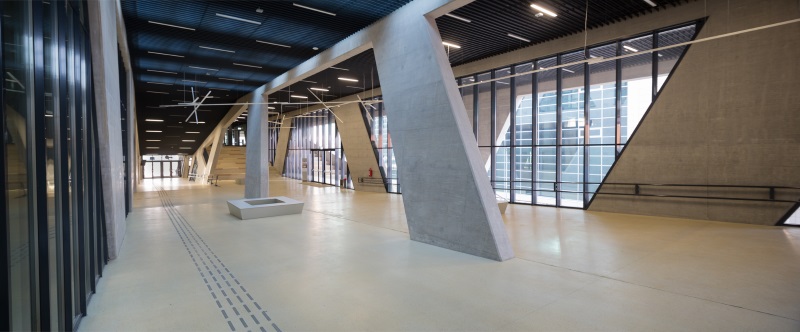 Sredina zgrade rastvorena je po cijeloj duljini nizom unutrašnjih terasa i svjetlarnika, koje su mjesta za neformalnu interakciju, učenje i rad.