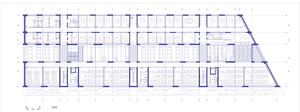 Svi hodnici imaju otvorene krajeve, čime se naglašava otvoreni karakter zgrade i omogućuje dodatno osvjetljenje.