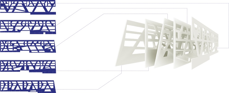 Nosivu konstrukciju čini pet kontinuiranih nosača izvedenih u natur armiranom betonu. Naglašavaju osnovni poprečni profil zgrade.