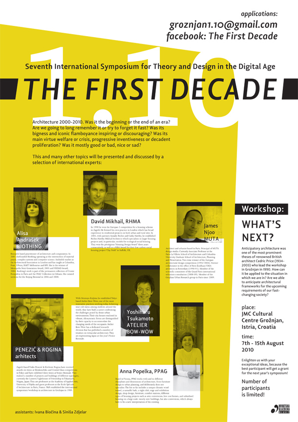 Tema ovogodišnjeg simpozija je Prvo desetljeće: Arhitektura 2000. – 2010. Problematizirati će se arhitektura dekade na izmaku, s pitanjima poput označava li to početak ili kraj jedne ere? Hoćemo li pamtiti desetljeće ili ga poželjeti brzo zaboraviti? Je li njegova ikonička kićenost bila inspirativna ili obeshrabrujuća? Je li nagovijestilo inventivna rješenja ili puku proliferaciju?