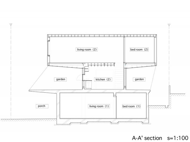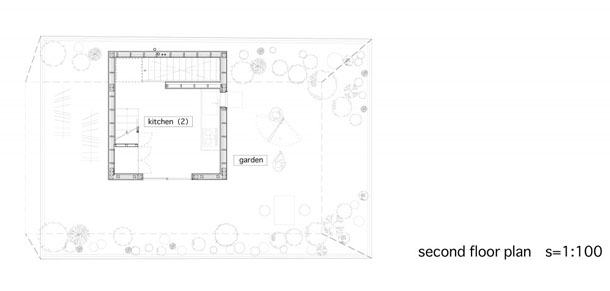 Arhitekti su takozvani vrt, odnosno dvorište kuće podigli na središnji kat građevine, između dviju stambenih etaža (prizemne roditeljske etaže i najviše etaže za djecu i unuke). Tako su formirali prostorni sendvič katova, gdje središnji sloj „sendviča“ postaje zona manjih tlocrtnih dimenzija u koju je smještena pripadajuća kuhinja koja se programatski prelijeva na prostor eksterijera, a površina terase koja je okružuje izlazi iz tlocrtne forme donjeg i gornjeg kata stvarajući prostranu palubu.