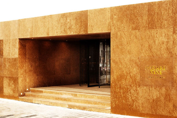 Koncept hotela osmišljen iz želje vlasnika da Beogradu ponudi luksuz sa mnogo prisnijim karakterom, nego li to učinili ostali međunarodni hoteli čije franšize imaju unificiranu pojavnost. Square Nine Hotel smješten je na jednu od rijetkih gradskih lokacija na kojima je dozvoljena gradnja- preko puta Studentskog trga i u blizini Narodnog pozorišta i Narodnog muzeja. Sam hotel ima pet katova na kojim se nalazi 45 suvremeno uređenih apartmana, restoran, predvorje, lukuzni spa i dvorana za konferenciju. Arhitektura Square Nine Hotela koristi jezik moderne, ali ne zasjenjuje okolnu gradnju, dapače, slijedi njezinu veličinu i ritam okolnih fasada- sustavom otvora i korištenjem prigušenih tonova smeđe boje. Relativno zatvorena i monumentalna fasada ipak ne dominira ulicom, a svaki od 35 otvora, ujedno je i balkon pojedinog apartmana. Bočne strane zgrade obložene su drvenim letvicama, što djeluje poput ornamenta, ali i veoma tradicionalno.