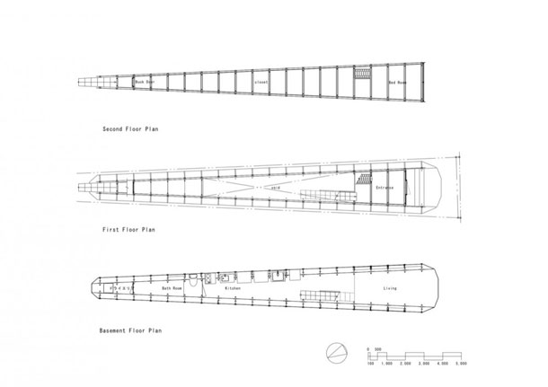 O domišljatim i inspirativnim konceptima, koje japanski arhitekti koriste pri projektiranju kuća na gotovo nemogućim parcelama preizgrađenih metropola Japana, pisali smo već u nekoliko navrata (kuća Between / Katsuhiro Miyamoto & Associates, kuća On the cherry blossom / A.L.X., kuća bez prozora / Suppose design office). Danas vam predstavljamo kuću sagrađenu na parceli koja naizgled djeluje kao mjesto gdje je podizanje ovakvog objekta, sa svim potrebnim sadržajima, gotovo nemoguće. No arhitekti iz arhitektonske prakse Atelier Tekuto, bazirajući rad na organiziranoj kolaboraciji između klijenata, dizajna, strukture, konstrukcije te izvođača, uspjeli su isprojetkirati i sagraditi obiteljsku kuću Lucky Drops, na neobičnoj i zahtjevnoj izduženoj trapezoidnoj parceli. Najuža dimenzija prizemne ulične fasade tek nešto šira od jednog metra, dok se u visini još i sužuje na nevjerojatnih 70 centimetara. Ovakvi prostorni odnosi posljedica su ograničavajućih karakteristika parcele, ali i lokalnog zakona koji zahtjeva odmicanje novog objekta od za pola metra od okolne izgradnje. Kuća je inače smještena u Tokyju, udaljena tek dvadesetak minuta vlakom od centra glavnog grada Japana. Spomenuti parametri rezultirali su i činjenicom da kuća ima neobičnu formu, te sugerira sadržaj kojeg će prolaznik teško detektirati kao obiteljsku kuću. Više o projektu, prostornoj podijeli, upotrijebljenim materijalima i ostalim detaljima o neobičnom japanskom stambenom objektu pogledajte ovdje.