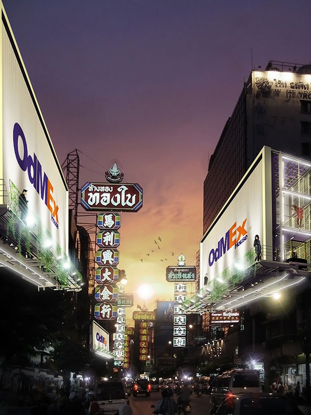 Strana kontejnera koja gleda prema ulici uvijek je zakrivena billboardom, što omogućuje dovoljno privatnosti stanovnicima, ali i dovoljnu protočnost svjetlosti i zraka na ostalim otvorenim stranama. Ovakav pomalo kontroverzan način stanovanja može djelovati izrabljivački, no kada promislimo da danas gotovo na svakoj fasadi kuće možemo vidjeti ovješene reklamne panoe za koje se plaćaju minimalni prihodi vlasnicima stanova, poprilično srozavajući njihovu kvalitetu života i maksimalno otežavajući percepciju arhitekture i urbanističkih dimenzija grada, onda ovaj način djeluje poprilično pošten omjer snaga. No o problemima urbanog advertisinga više možete pročitati u tekstu Fedora Kritovca ovdje.