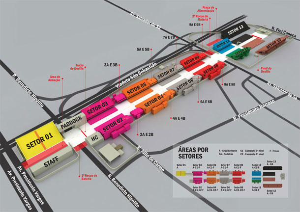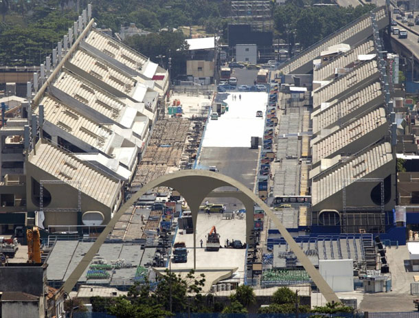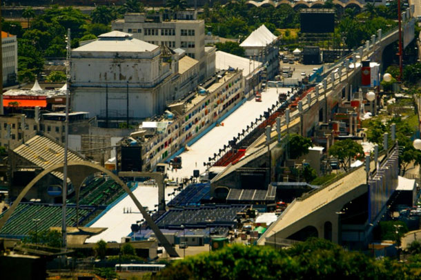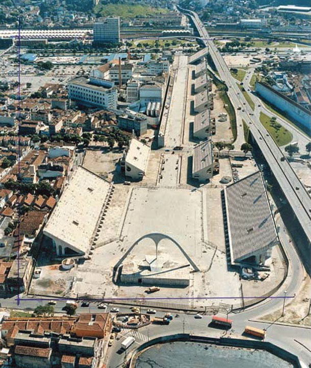 Sambadrom je čak 700 metara dug stadion, longitudinalni plato duž kojeg svake godine u ovo vrijeme paradiraju na tisuće plesačica i plesača školi sambe iz Ria. Sambadrom je obrubljen redovima tribina, gotovo uvijek dupkom ispunjenim desetcima tisuća gledatelja. Kraj najduže svjetske piste za ples i zabavu markiran je kolosalnim lukom, forme karakteristične za Niemeyerovu arhitekturu, a ispod njega se nalazi muzej sambe.