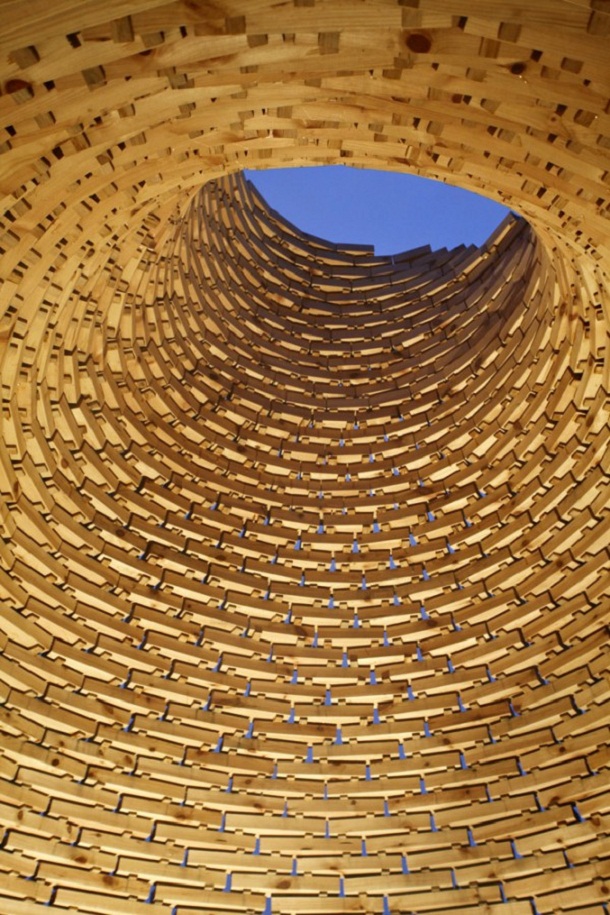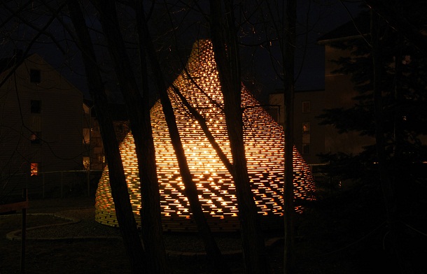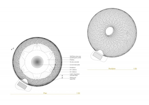 Drvena konstrukcija dimenzija 5,2 x 4,5 m, čiji je konični oblik inspiriran tradicionalnim norveškim kolibama, pričvršćena je na laganu betonsku ploču koja meandrira oko upuštenog ognjišta. Samu konstrukciju sačinjava 80 slojeva kružno posloženih drvenih elemenata, recikliranih sa obližnjeg gradilišta. Krugovi variraju u radijusu i imaju relativno izmaknuto središte jedan u odnosu na drugi. Svaki krug sastoji se od točno 28 drvenih letvica posloženih tako da osiguraju efekt dimnjaka, zaštitu od oborina i vjetra te da omoguće prodor dnevnog svjetla i provjetravanje prostora.