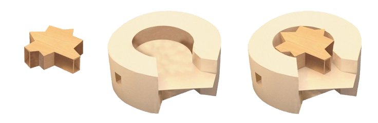 Projekt je pretpostavio miješanje postojeće geometrije utvrđenja, pretežito kružnog oblika, s formom manjeg paviljona, elementa koji kao da se došuljao i uskočio u unutrašnjost ove rotunde. U početku je bilo zamišljeno da se zvjezdoliki drveni paviljon prethodno sagradi na drugoj lokaciji pa naknadno, uz pomoć dizalice, „ubaci” u korpus utvrde. No to nije bilo moguće pa je paviljon montiran na lokaciji, uz veliku pažnju pri očuvanju rekonstruiranih i restauriranih zidina. Na kraju projekta su autori dobili zadatak reaktivirati i okoliš lokaliteta. Osobito je važno bilo naglašavanje originalnog obrambenog jarka. Upotrijebljene su metalne mreže te drveni elementi popločenja, pretežito privremene konstrukcije koje se, s obzirom na eventualne buduće planove za okoliš građevine, mogu lako adaptirati ili ukloniti.