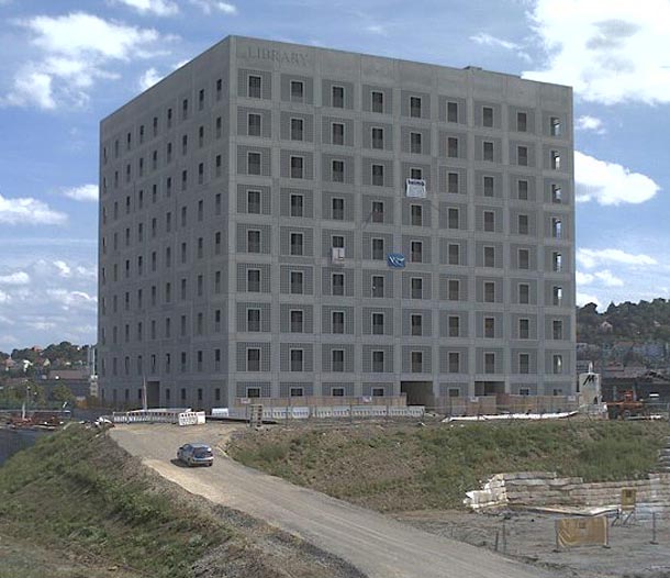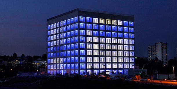 Monumentalna kocka (u svakom slučaju točan naziv) nadgleda grad, smještena u udolinu okolnih brežuljaka svjedoči o svojoj važnosti. Devet puta devet otvora na fasadi poprilično djeluju zastrašujuće, dozivajući u sjećanje neke primjerke totalitarne arhitekture, iako čitavu strogoću (uspješno) umanjuje noćna igra plavim fluorescentnom svjetlom koja se razlije po otvorima.