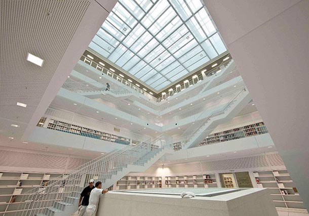 Točno prije godinu dana u Stuttgartu je otvorena Neue Bibliothek, novi gradski landmark koji veliča ljudsko znanje. Projekt potpisuje koreanski arhitekt i profesor Eun Young Yi, a riječ je o naizgled konvencionalnoj monumentalnoj kocki izuzetne strogosti i simetrije fasada. Upravo zbog svojih vanjskih kvaliteta, građani Stuttgarta nazivali su je Stammheimom II, odnosno inačicom ozloglašenog stuttgartskog zatvora gdje su nekoć bili pritvoreni pripadnici RAF-a. Bilo da je njezin naziv opravdan ili ne, činjenica je da se knjižnica nalazi u središtu najvećega gradskoga gradilišta, mjesta buduće Europske četvrti, stambeno-poslovnog projekta vrijednog vrtoglavih 550 milijuna eura. Ipak, knjižnica će samo još neko vrijeme biti u centru gradilišta, sve dok 2015. u središtu Europaviertela ne nikne hram 21.stoljeća – trgovački centar. Naravno, čitavu četvrt ujedinjuje kontroverzni projekt rekonstrukcije željeznice Stuttgart 21.