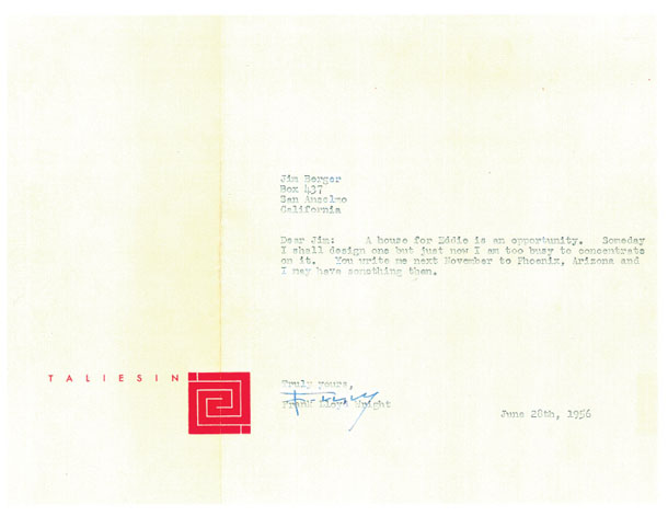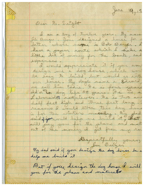 No, kako povijest (arhitekture) često ne ispisuje one male životne priče, tako je alternativnim putevima na danje svjetlo došla i priča o jednoj psećoj kućici, odnosno prepiska jednog dvanestogodišnjeg dječaka i velikog arhitekta. Iz nje je iznikno Wrightov projekt „Jim Berger doghouse“, u razgovoru poznatiji kao kućica za labradora Eddija.