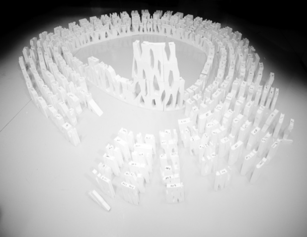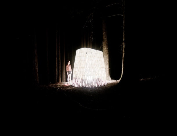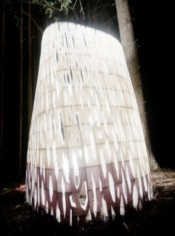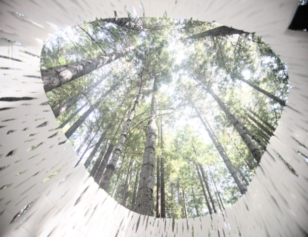 Krećući se oko i unutar instalacije, promatrača dočekuje začuđujuća sličnost igre svjetlosti razbijene kroz krošnje stabala i porozne kore instalacije.