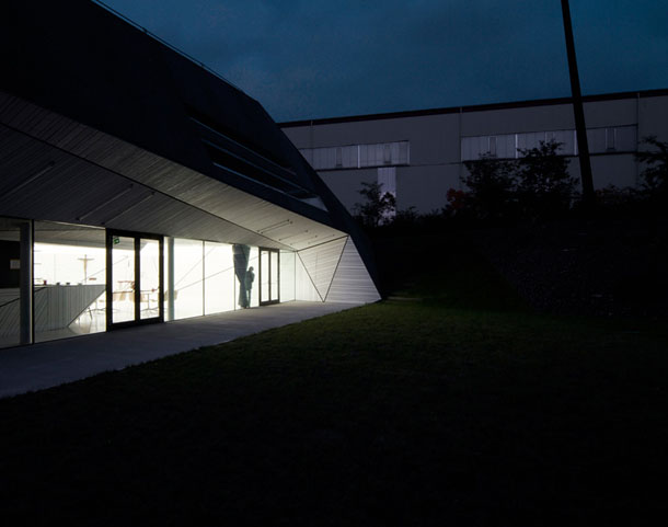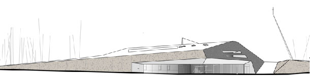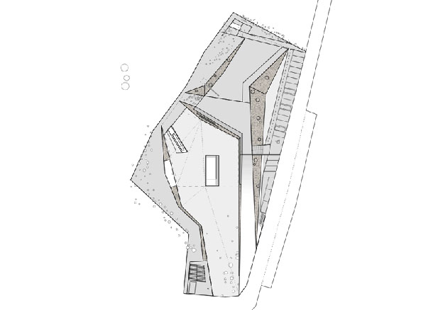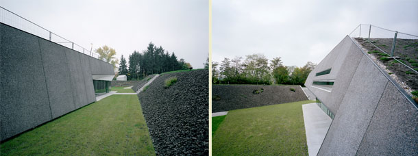 Završna obloga fasade koju čini tamni kamen, potencira snažni kontrast naspram intenzivno zelene livade na kojoj je novosagrađeni kompleks podignut. Uokolo kompleksa ostavljena je uređena zona iskopa koja naglašava kako struktura ne izlazi iz zemlje, već se adaptira i potencira dramatiku dijaloga parcele s zgradom.