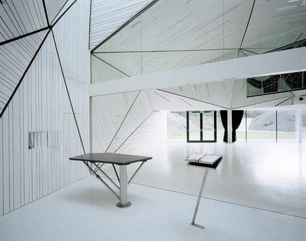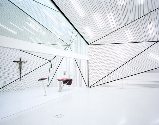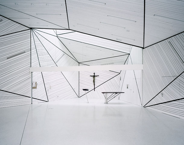 Možda najdojmljiviji element projekta jest njegov interijer, koloristički i po odabiru materijala u apsolutnom kontrastu od vanjštine, kojim dominira bijela boja, naglašena dinamika te poligonalni elementi koji ravnopravno definiraju strop i zidove. Geometrizirana i pomalo apstraktna struktura interijera negira sve forme i rasporede koje ste u crkvenim halama navikli gledati te su samim time, u potpunom raskoraku od estetike interijera, direktno naglašeni sakralni elementi križa, govornice i oltara.