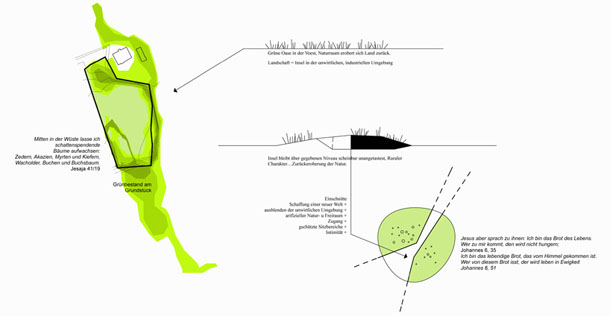 Okolišem parcele, osim spomenute industrijske izgradnje, dominira šumoviti krajolik koji je arhitektima poslužio kao početna točka projektiranja, jer svoj projekt grade na konceptu izgrađenog pejzaža koji se uklapa o okoliš, arhitekturom se prilagođavajući na padinu terena na kojem je sagrađen.