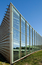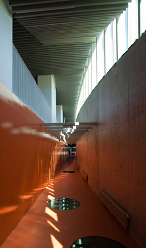 Valovita topografija okolnog krajolika pojačana je postavljanjem zgrade na umjetni brežuljak, svi uglovi kutijastog volumena razvučeni su, formirajući konkavne linije u tlocrtu i na fasadama, tako da je zgrada organički integrirana s krajolikom. Podignuta razina tla formira ”jastuk”za poluukopanu zgradu i na taj način optički smanjuje njenu veličinu, a nastavlja se u valovitim formama, uokvirujući vanjske sportske terene i biciklističke staze, prema obližnjoj dolini.