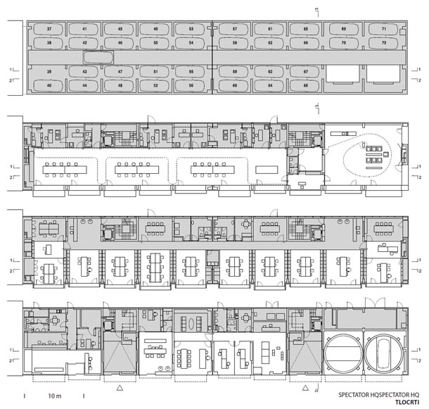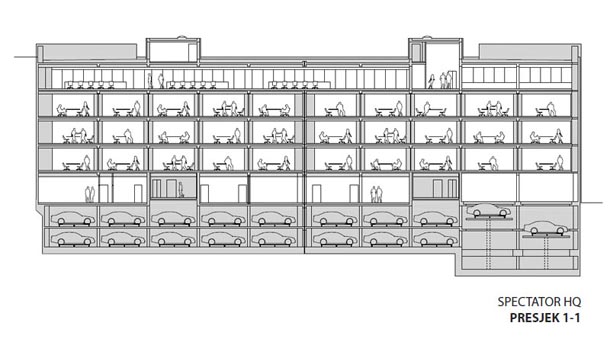 Uvodne napomene – Zadatak ovog projekta bio je preoblikovanje postojećeg projekta (rekonstrukcije zatečene zgrade na parceli) za sjedište Spectator Grupe. U trenutku početka angažmana otvoreno je gradilište, te su započeti radovi iskapanja i zaštite građevinske jame, što je odredilo karakter projekta. Prethodno projektirani armirano-betonski skeletni sistem je zadržan, a modifikacije u konstruktivnom sistemu vezane su za jezgre stubišta. Ideja/metodologija rada bila je zadržati projektirano stanje konstruktivnih elemenata u što većoj mogućoj mjeri, a intervenirati laganim konstrukcijama.