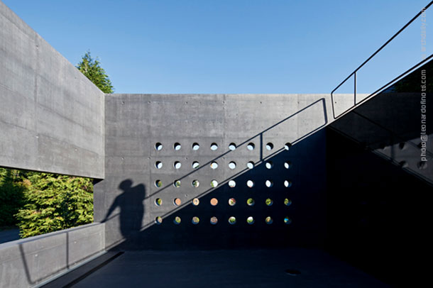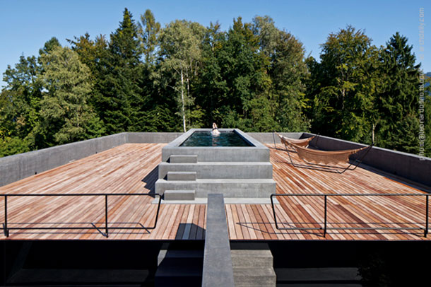Igra različitih vrsta komunikacije nastavlja se sve do krovne terase s bazenom, gdje se drveno stubište pretvara u betonsko. U prizemlju pak, nalazi se geotermalna pumpa kojom se mogu koristiti obje obitelji tako da je domaćinstvo gotovo maksimalno samoodrživo.