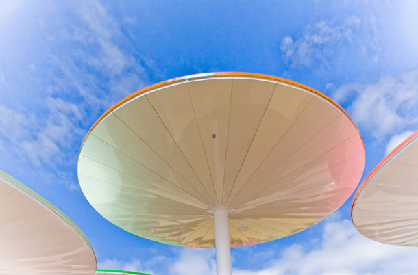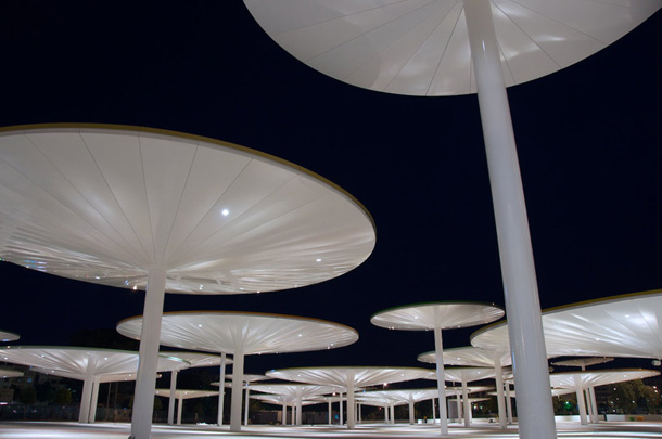 Gotovo svaki od prefabriciranih suncobrana međusobno se razlikuje visinom i promjerom. Izuzev funkcije nadstrešnice i rasvjetnog elementa, obojani suncobrani ekološki su osviješteni, pa ovisno o vremenskim prilikama preuzimaju i ulogu kišobrana, sakupljajući kišnicu u inkorporirane drenažne odvode.