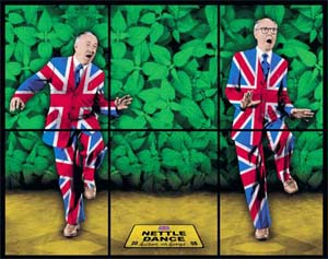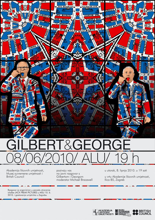 Dugo očekivana izložba u zagrebačkom MSU, otvara se u četvrtak, 10.6. Ciklus slika velikog formata pod nazivom „Jack Freak Pictures“, posveta je britanskoj zastavi. Union Jack je politički i sociološki veoma konotativan simbol, čija kulturološka važnost seže od mode do nacionalizma. Poigravanje britanskom zastavom i svojim likom rezultira istodobno izuzetno kompleksnim i duhovitim radovima. Međutim, „žive skulpture“ će u utorak, 8.6. u 19 h održati javni razgovor sa moderatorom Michaelom Bracewellom. Odabir Akademije likovne umjetnosti u Ilici 85, čini se kao idealno mjesto za ovu vrtnu čajanku. U srijedu, 9.6. u 19 h, nastavlja se Gilbertovo & Georgeovo upoznavanje sa zagrebačkim pulsom u kinu Europa gdje će biti održana projekcija filma Tim Marlow s… Gilbertom i Georgom.