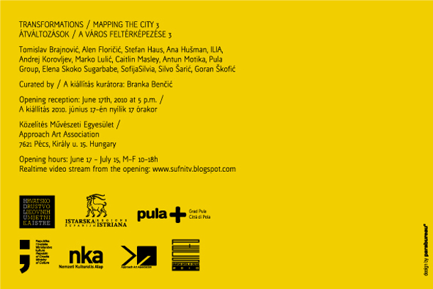 Fotografija, film, tv i drugi vizualni mediji posreduju urbani, gradski prostor i pridaju mu slojeve značenja. Filmovi i gradovi oduvijek su se ispreplitali, od avangardističkih „simfonija velegrada“ Fritza Langa do Bladerunnera ili Matrixa. Različiti mediji istražuju različite načine na koje urbani pejzaži transformiraju umjetničku produkciju, i obrnuto. Kakva je uloga medija u oblikovanju i preobražavanju urbanog krajolika i našeg kolektivnog urbanog iskustva, dok se sa svakim pomakom (estetske) paradigme mijenja i naše poimanje grada – dinamika životnih stilova, slojeva kulture… To pitanje postavlja izložba ”Transformacije/ Mapiranje grada 3”, koja je otvorena krajem prošlog tjedna u galeriji Kozelites u Pečuhu, u okviru programa Europske prijestolnice kulture.