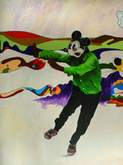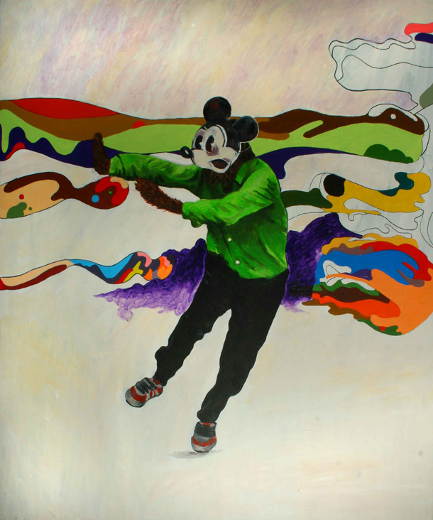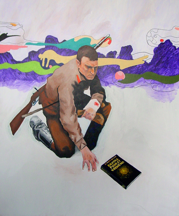 “U hijerarhiji umjetničke produkcije Rene Bachrach Krištofić odlučio se za slikarstvo. Njegovu najnoviju seriju karakterizira ponešto od likovnoga repertoara s kojim smo se susreli i ranije. Likovi u uniformama lica prekrivenih karnevalskim maskama, vojnici, pripadnici raznih kulturalnih skupina kao i likovi preuzeti iz trash-filmova često su prikazani u imaginarnim prostorima u kojima prevladavaju psihodelični kamuflažni uzorci agresivnih boja. Na slikama nailazimo na razne elemente koji čine dio naše zajedničke povijesti; ‘porazbacani’ su po platnima metodom izrezivanja, preuzimanja i miješanja te ‘prihvaćaju’ zahtjevnu zadaću da u nedefiniranim prostorima, u kojima osjećamo raspad sistema, funkcioniraju kao dijelovi koji pripomažu u stvaranju novih vrijednosti.”