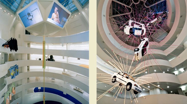 Zgrada muzeja Guggenheim u New Yorku od svog je otvorenja 1959. godine služila kao inspiracija za inovacije, izazivajući umjetnike i arhitekte da odgovore na njeno ekscentrično, organičko oblikovanje. Tijekom godina središnja praznina rotunde iznudila je mnoge jedinstvene odgovore koji su se manifestirali kroz brojne site-specific izloške i instalacije.