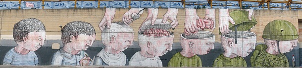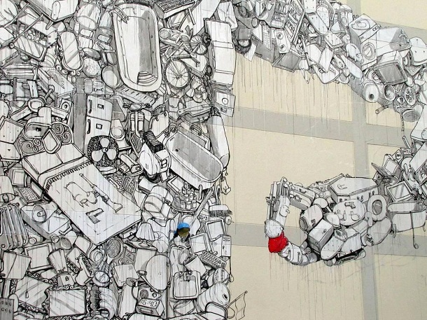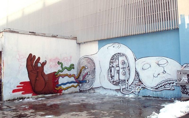 Ulični umjetnik koji se skriva pod pseudonimom „Blu“ tehnikom stop motiona stvara sjajne, ali bizarne animacije koje propitkuju teme prolaznosti, transformacija te gubitka identiteta. Njegovi nezgrapni likovi šeću se kroz urbano tkivo grada, prelijevaju se preko rubova zgrada i izviru iz gradskih pora.