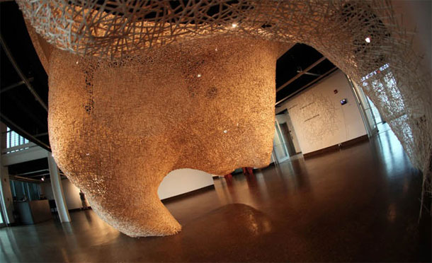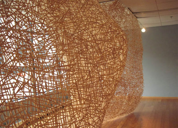 „Too much coffee ?“ pitanje je koje bi mogli postaviti umjetniku Jonathanu Brilliantu za njegov, kao što i samo prezime autora sugerira, briljantni projekt. Naime, autor je za svoju seriju prostornih instalacija Have Sticks Will Travel koristio drvene žličice, upravo one kojim vjerojatno miješate svoj jutarnji machiatto „to go“. Brilliant svoje skulpture, site specific projekte, izvodi na licu mjesta, odnosno u galeriji u kojoj izlaže, svaki put stvarajući novu prostornu strukturu. Ono što je osobito važno za njegove kontinuirane forme od drvenih štapića jest činjenica da umjetnik ne koristi nikakvo spojno sredstvo, ne lijepi ih, već čitave konstrukcije statički funkcioniraju zbog međusobne napetosti. Više o njegovim projektima pogledajte ovdje.