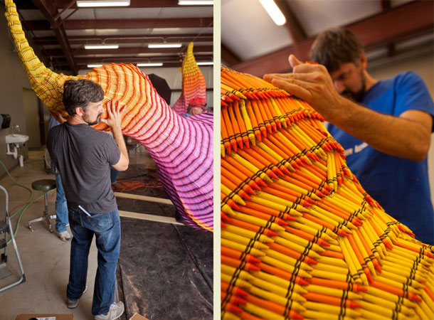 Suvremena umjetnost je davno prestala podrazumijevati da su oblikovni materijali skulptura mramor, kamen i željezo, pa najuspješniji kipari i umjetnici današnjice u stvaranju svog izričaja barataju s najrazličitijim materijalima i stvarima. Već smo u nekoliko navrata pisali o predmetima iz svakodnevne upotrebe iskorištenih u kontekstu umjetničkih instalacija, a danas vam predstavljamo autore koji svoje prostorne kreacije stvaraju od, za umjetnost, poprilično neuobičajenih elemenata; lanaca bicikla, pastelnih bojica i drvenih žličica za miješanje kave.