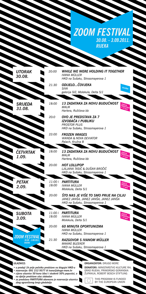 Upravo predstava While We Were Holdinig It Together otvara ovogodišnji Zoom festival 30.kolovoza u 20:00 sati u prostoru HKD-a na Sušaku. Na određeni način ovo je manifestni uradak Ivane Műller, jer njime umjetnica propituje većinu problema koji ju zanimaju u kazalištu. WWWHIT se prvenstveno bavi odnosom tijela i uma, a rezultat je poetska, humoristična i filozofična predstava koja i dalje oduševljava europsku publiku, iako je nastala davne 2006. godine. Osim WWWHIT na festivalu Zoom, Ivana Műller bit će prezentirana i najnovijim radovima: predstavama 60 minuta oportunizma i Partitura.