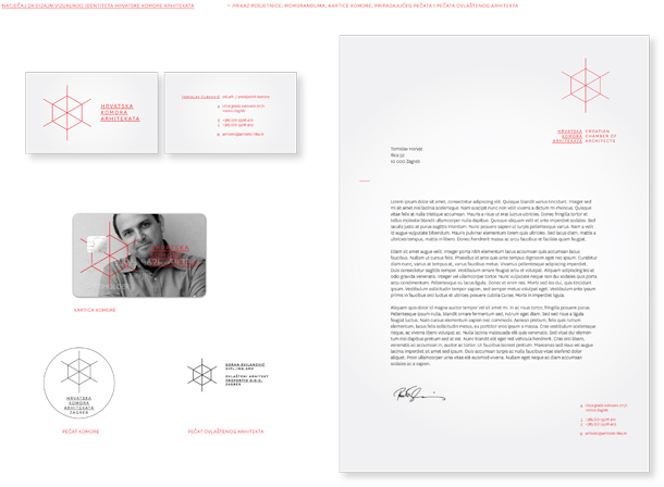 „Of all the entries that exploit the motif of the cube, which was clearly a big ‘hit’ among the contestants – both because of its connotation of the orthogonal space and because there is a link between the cube and the Croatian national identity – this particular entry is the most successful one in terms of its visual articulation and further development; as it also ‘detaches’ the cube from stereotypes. Here, the motif of the cube in isometric axonometry balances between two-dimensional and three-dimensional space. Balancing between sign and logo, by using equally thick line, is in accordance with the architectural design consistency and also it is respectful of the historical architectural drawings’ principle –from stereotypes to CAD programs. The right choice of style gives this solution; i.e. entry; the seriousness and the simplicity it needs while also giving it a humanistic charm in that it deals with details of this modern interpretation of the grotesque in a subtle way. The same reductionist principle continues consistently by using only one corporative color.