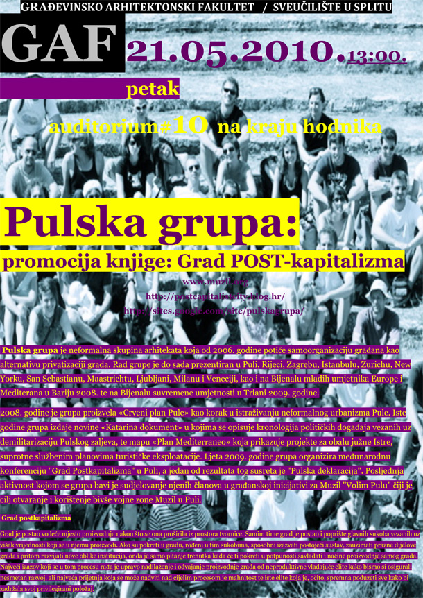 U petak 21. svibnja, u sklopu ciklusa predavanja Auditorium na splitskom GAF-u, održati će se promocija knjige Grad POST-kapitalizma o kojoj smo pisali ovdje, čiji su autori okupljeni u neformalnoj skupina arhitekata pod imenom Pulska grupa. Deseti u nizu auditorium započinje u 13.00 sati.