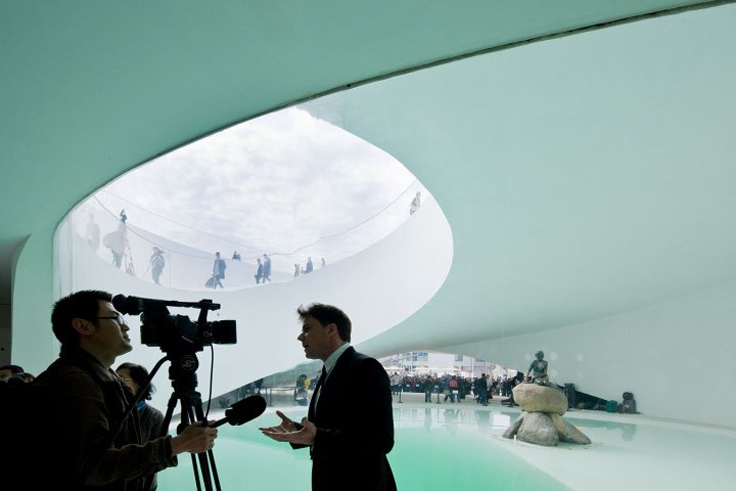 The Danish Pavilion in Shanghai isn’t just a visually attractive design, its concept and realization perfectly capture the Danish spirit, permeated with the unofficial slogan of promoting the country’s ecology and sustainability. The basic form of the facility is a large loop on which visitors can ride one of the 1.500 bicycles provided at the entrance, thus depicting an image of the actual urban Danish lifestyle, alongside the availability and omnipresence of the ecologically-aware mode of transport. A large pool is situated in the center of the rotunda where visitors can go swimming. The particularity of the pool lies within the fact that it is filled with fresh water from one of the cleanest world harbors, of course, the Copenhagen one. For the needs of the Expo even the Little Mermaid, the most famous symbol and trademark of Denmark’s capital, has been temporarily moved to the Pavilion, as it was, in Bjarke Ingels’ words, considerably more resource efficient moving The Little Mermaid to China, than moving 1.3 billion Chinese to Copenhagen.