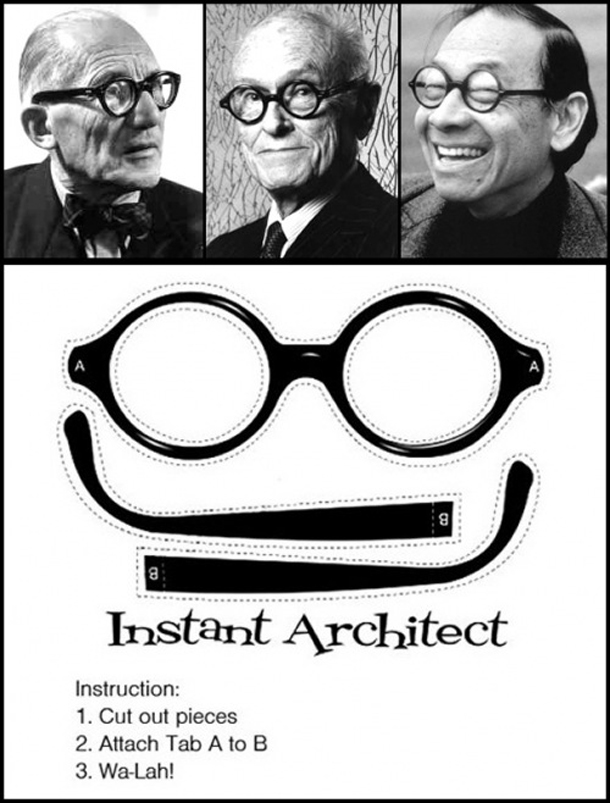 Pitanje je zapravo pojave arhitekta te uspostave prvog kontakta s klijentima. A uvriježeni stereotip arhitekta je crna odjeća i naočale s crnim plastičnim okvirima. U ovu kategoriju ubrajamo mnoge poznate arhitekte pa njihove odgovore potražite u gore spomenutoj knjizi.