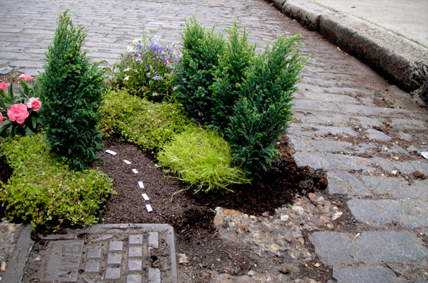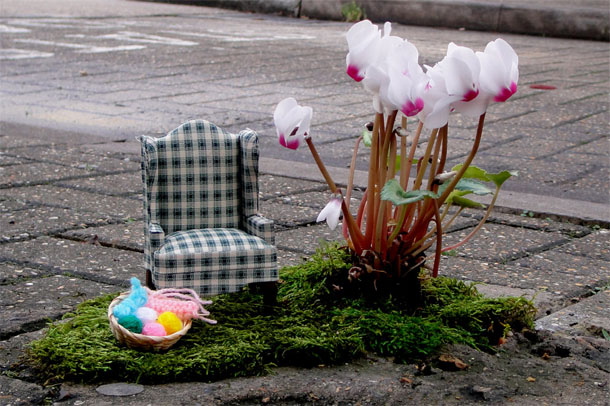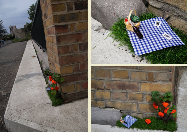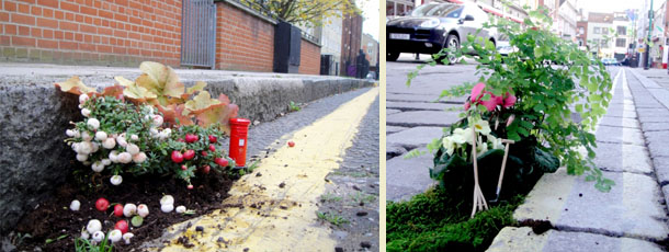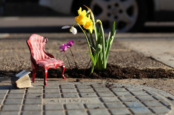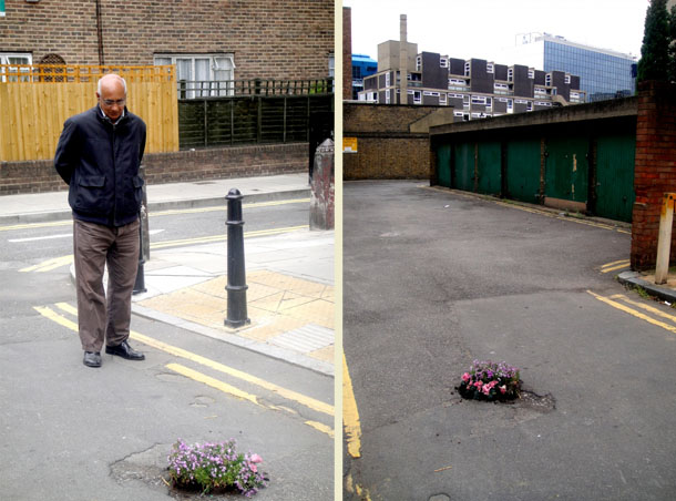The Pothole Gardener je misteriozni gerilski vrtlar koji svoje male zelene instalacije „sadi“ po uličnim rupama istočnog Londona. Njegov koncept podrazumijeva naglašavanje nedostatka zelenila, zelenih zona, parkova i vrtova u naseljenim i preizgrađenim zonama gradova te ujedno problematizira oštećenu i uništenu infrastrukturu cesti i pločnika.