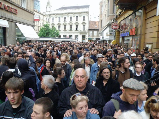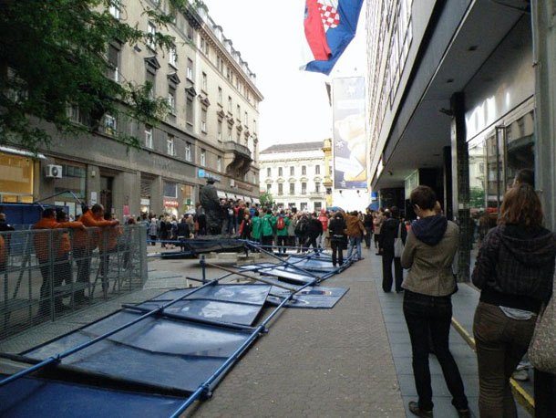 Građani ne odustaju od ”obrane” Varšavske ulice, gdje ih se jučer u 18 sati okupilo oko tri tisuće. Točnije, većina ih je bila na Cvjetnom trgu, jer je policija zagradila prilaze Varšavskoj ulici iz sigurnosnih razloga, objasnili su, jer je ograda unutar koje su trebali početi iskopi za rampu za garažu srušena pa bi se netko mogao ozlijediti. Tako da je manji broj prosvjednika koji su došli ranije ostao ”zarobljen” unutar Varšavske dok ih je većina bila na Cvjetnome trgu.