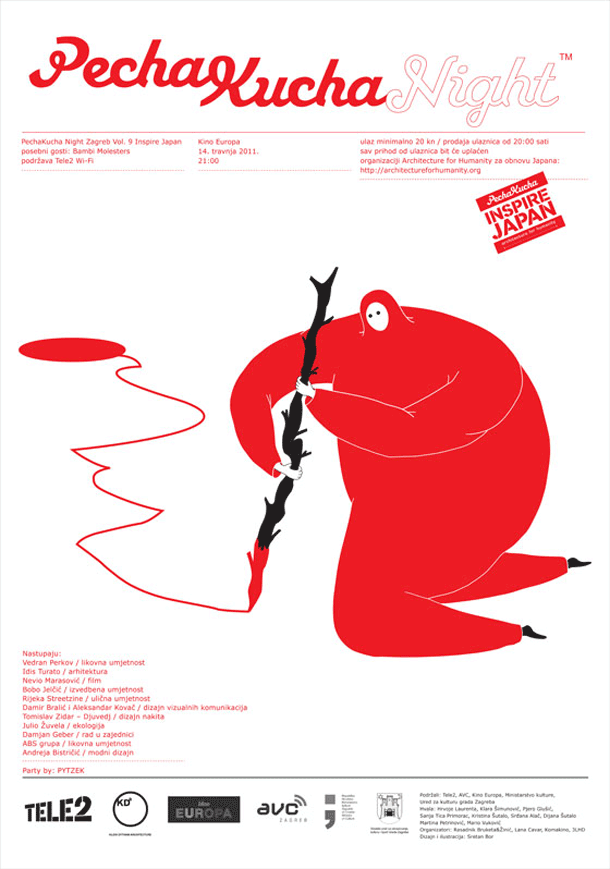 U četvrtak 14. travnja u Kinu Europa s početkom u 21:00 sat održat će se deveta po redu PechaKucha Night Zagreb u organizaciji Rasadnika Bruketa&Žinić, 3LHD-a, Komakina i Lane Cavar te uz podršku Tele2. Po drugi put zagrebačka PechaKucha priključuje se globalnoj humanitarnoj akciji svih 400 svjetskih PechaKucha gradova, ovaj put kako bi se upravo japanskim izumom za predstavljanje kreativnih praksi pomoglo zemlji njezina nastanka. PechaKucha Night su vremenski limitirane neformalne prezentacije kroz koje različiti kreativci u jednoj večeri svojim pričama inspiriraju publiku, a nastale su prije osam godina u Japanu te se ubrzo proširile na preko 400 gradova diljem svijeta. U Zagrebu od početka 2009. ova događanja svaki put okupljaju sve veći broj publike i održavaju se svaki put na nekoj drugoj lokaciji. Svatko tko se predstavlja smije koristiti točno 20 fotografija i ima 20 sekundi za priču o svakoj od njih, odnosno točno 6 minuta i 40 sekundi slave prije nego što na red stiže sljedeći.