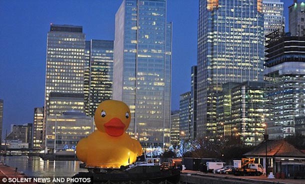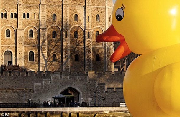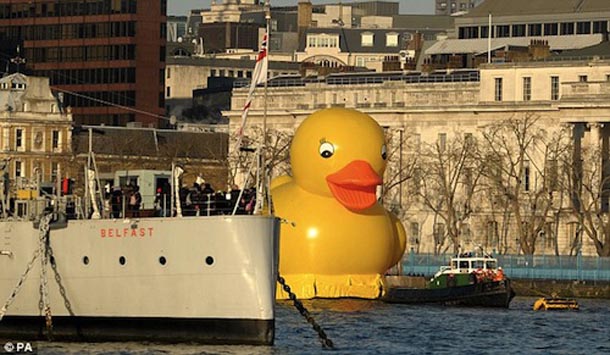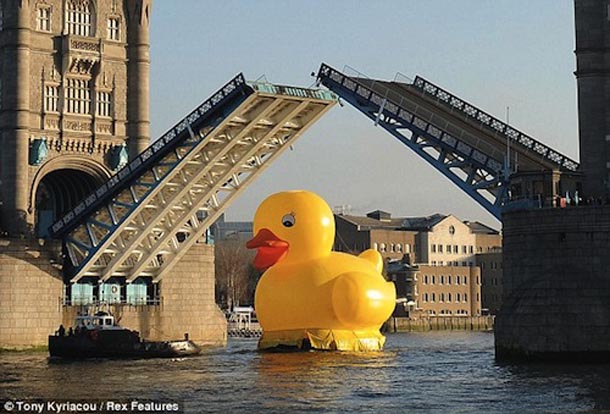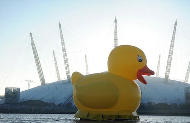 Vjerujte nam, ovo nije novinarska patka. Zaista se dogodilo- gigantska gumena žuta patka plivala je Temzom prolazeći pokraj poznatih londonskih znamenitosti. Ideju je lansirala web stranica Jackpotjoy.com koja je željela prezentirati svoju novu inicijativu “FUNdation”, kojom nudi 250.000£ za financiranje šaljivih projekata s ciljem razveseljavanja nacije u ovim ekonomski teškim vremenima. A baš zbog tih ekonomski teških vremena, ostaje nam nejasno kako su mogli promislili da bi se patkica koja je uobičajeni stanovnik dječjih kada, sada u prenapuhanom izdanju, dobro snašla na Temzi i zašto bi to uopće bilo ekonomski, ali i konceptualno opravdano. Bilo kako bilo, nije nam poznato koliko je patka ipak uspjela razveseliti ljude, ali ih je sigurno iznenadila kad su je ugledali kako mirno pliva dok su se oni primjerice vozili na posao.