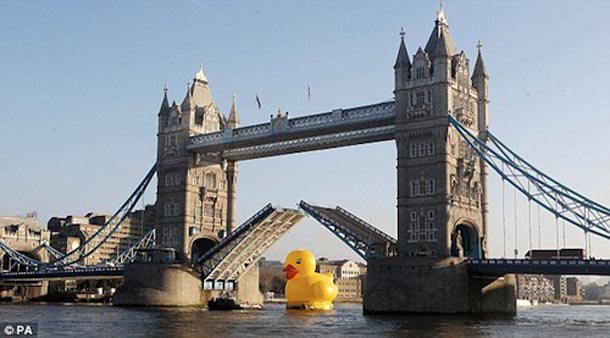 Nabildana patka dosegla je visinu od preko 15 metara pa je tako zbog njenog stasa bilo neophodno podignuti Tower Bridge kako bi ona mogla nastaviti svoje putovanje.