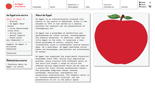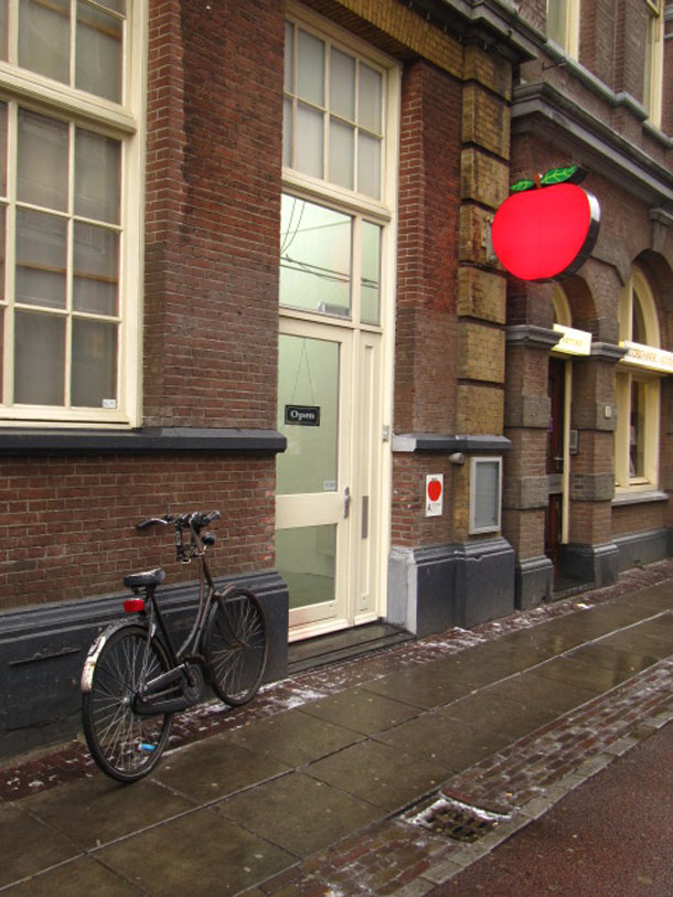 Neizostavni motiv svake turističke kampanje Nizozemske jesu tulipani, ali sada vam donosimo priču nakon koje ćete u svakom idućem posjetu Amsterdamu tražiti zdravu, crvenu jabuku. Upravo takva jabuka zaštitni je znak umjetničkog centra de Appel, osnovanog 1975. godine, najdugovječnije institucije neprofitabilnog karaktera u Nizozemskoj. Crvena jabuka logo je koji de Appel koristi od svojih početaka, a nastao je po uzoru na jabuku u dječjoj bojanci gdje je crtež povezan s velikim slovom A (na nizozemskom appel znači jabuka). Iz te veze očitava se i želja centra za vizualnim opismenjavanjem publike.