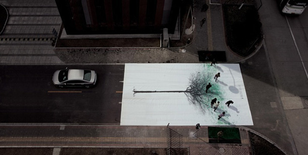 Jednostavan moto kampanje “više hodanja, manje vožnje” prvotno je reliziran na sedam raskršća u Šangaju. Platno dimenzija 12.6×7m s crtežom stabla bez lišća postavljeno je na mjestu pješačkog prijelaza. Sa strana platna, na pločniku, nalazi se spužvasta površina natopljena zelenom bojom – perivom, brzo sušećom i neškodljivom za okoliš. Svaki pješak koji prelazi raskršće zagazio bi u polje s zelenom bojom te svakim idućim korakom ostavio tragove, listove na platnu.