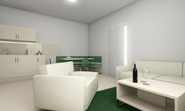 Oprema sobe meetings hotela s 3-4 zvjezdice pripada small and friendly kategoriji, a smještaj mora zadovoljiti poslovne i boravišne potrebe gosta. U relativno skučenom prostoru preklapaju se aktivnosti jer boravak uključuje spavanje povezano s odmaranjem, komunikacijom i radom. Tako su nastali modularni elementi koji nude četiri varijante rješenja, a soba je podijeljena na prostore za spavanje, boravljenje i rad, za higijenu te na ulazni dio. Presudno je da soba pruža sistematičnu, praktičnu i ekonomičnu organizaciju višefunkcionalnih dijelova interijera pa se prišlo oblikovanju hibridnih elemenata namještaja. Daljnja razrada omogućuje i stvaranje čitavih sustava soba.