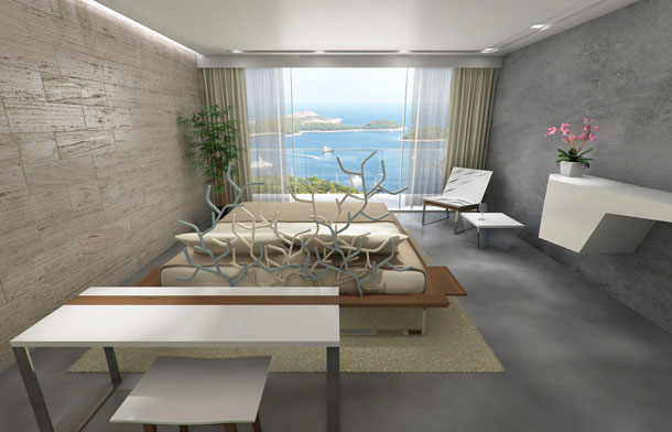 Luksuzna hotelska soba namijenjena je “novom turistu” koji traži doživljaj, a oblikovana je kao nastavak eksterijera u svrhu postizanja maksimalne usklađenosti s destinacijom – od valova, raspuklina na stijeni, preko prizora iz podmorja, do odraza sunca u moru. Ideja je da svaki element ima posebnu priču te da djeluje kao autorski projekt, po uzoru na umjetnička djela, koja su uvijek dio inventara luksuznih soba. Također, pojedine elemente moguće je dodatno prilagoditi konkretnim lokalitetima prenošenjem motiva koji su im svojstveni.