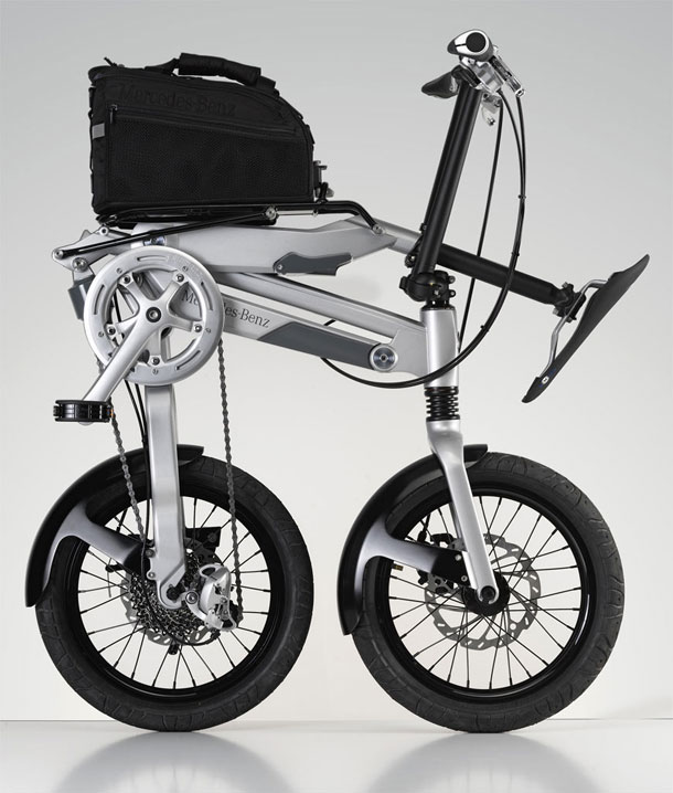 Foldingbike Mercedes – Ovo maleno tehničko čudo posjeduje patentirani sustav preklapanja s kojim je iznimno jednostavno rukovati. Sklapanje i rasklapanje traje svega nekoliko sekundi i ne zahtijeva nikakav dodatni alat. Kada je potpuno sklopljen bicikl zauzima svega 80x80x35 cm prostora i bez problema stane u torbu koja dolazi uz njega. Sklopivi aluminijski bicikl može biti postavljen i u jednu međufazu u kojoj ne možete pedalirati, ali ga možete gurati i na njemu prenositi prtljagu.