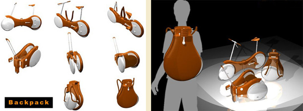 Backpack Bicycle ili bicikl ruksak težak je svega 5.5 kg. Svoju lakoću duguje dizajnerici koja je za glavni okvir umjesto metala iskoristila posebnu plastiku, a u čitav koncept ugrađeno je prednje i stražnje svijetlo te pokazivači smjera. On će vam pružiti sigurnu i udobnu vožnju za vrijeme gradske gužve a onog trena kad vam vožnja dosadi ili se umorite, sklopite ga u ruksak, stavite na leđa i bez problema nastavite dalje. Dužina bicikla iznosi dovoljnih 128 centimetara, širina 50 cm, a visina 80 centimetara. Dovoljna je samo jedna minuta da se bicikl pretvori u ruksak čija je visina 60 centimetara, a dubina svega 26 cm.
