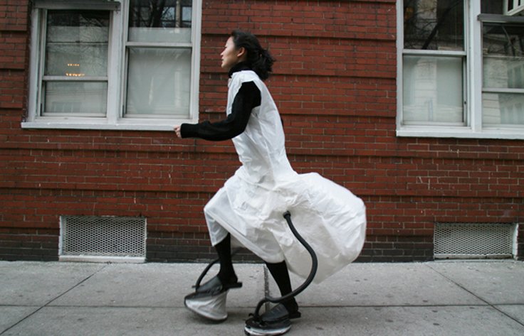Premda se u imenu ovog zanimljivog proizvoda otkriva njezina druga, potencijalna namjena, kreacija JooYoun Paek prvenstveno je ženska haljina. Izrađena je od polietilena te povezana s cipelama, koje, poput kakve pumpe, pri svakom koraku upuhuju zrak u zračni prostor na stražnjem dijelu haljine. Tako se naizgled obična haljina brzo može transformirati u stolac te korisnici omogućiti da na neko vrijeme sjedne gdje god to želi. Stolac se nakon određenog vremena, a pod utjecajem težine korisnika, ispuše te se ponovno pretvori u „običnu” ravnu haljinu. U zdravstveno-rekreacijskom smislu namjera proizvoda „Self sustainable chair” je, kako kaže autorica, da motivira korisnika na konstantni balans između kretanja i sjedenja, ali i da svakodnevnu uobičajenu rutinu hodanja pretvori u zabavni interaktivni performans.